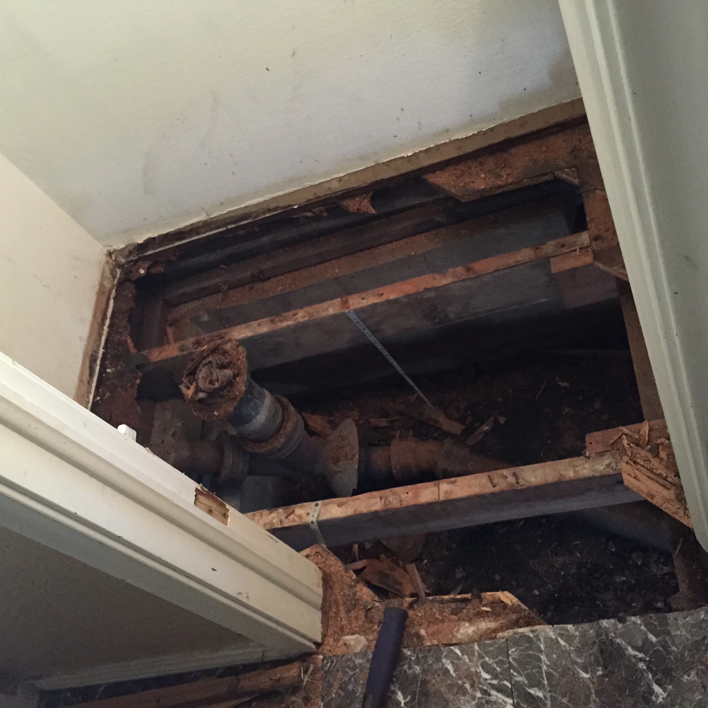 /The WORST room in the house when we bought was this half bath. It was tiny and the door swung inward so you had to walk in, squeeze by and then shut the door. We noticed pretty soon that when you sat on the toilet, it rocked a little back and forth. KB ripped up some flooring and saw a ton of wood rot. We obviously knew we wanted to replace that whole room, but it wasn't anywhere on our list at this point. So we just ripped out the rotten flooring and rocking toilet, covered the floor with some plywood and shut the door - not to look again until we were ready to make some changes.