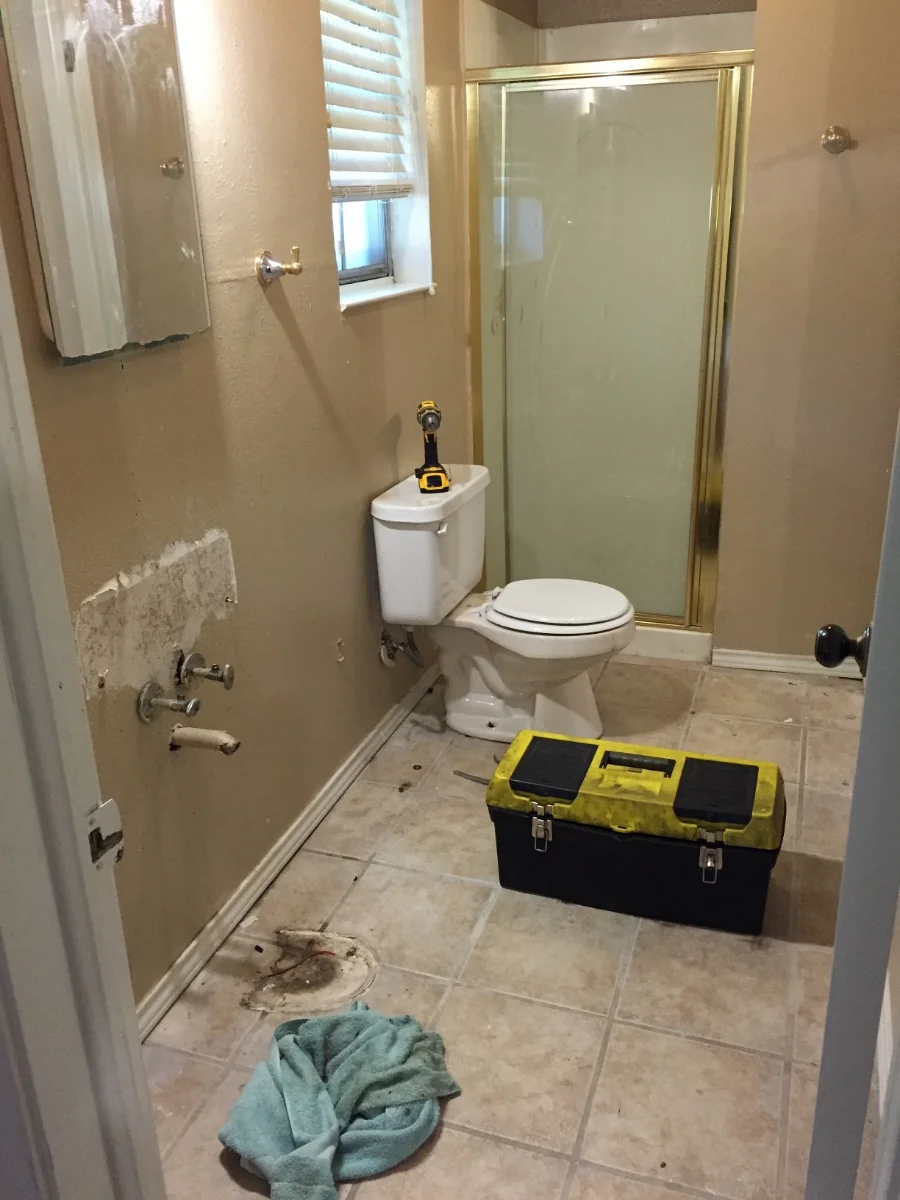 The pedestal sink was tossed. The toilet was tossed. The fixtures and the shower got demolished. The tiles were nasty. The shower was 24" wide and deep. A perfect square. It was moldy and short. When KB stood in it, the shower head was the same height as his chest. That wasn't going to work. We knew we needed a bathtub and a shower. We started with demo. It moved pretty quick - BUT, like any renovation - we ran into problems pretty early on.