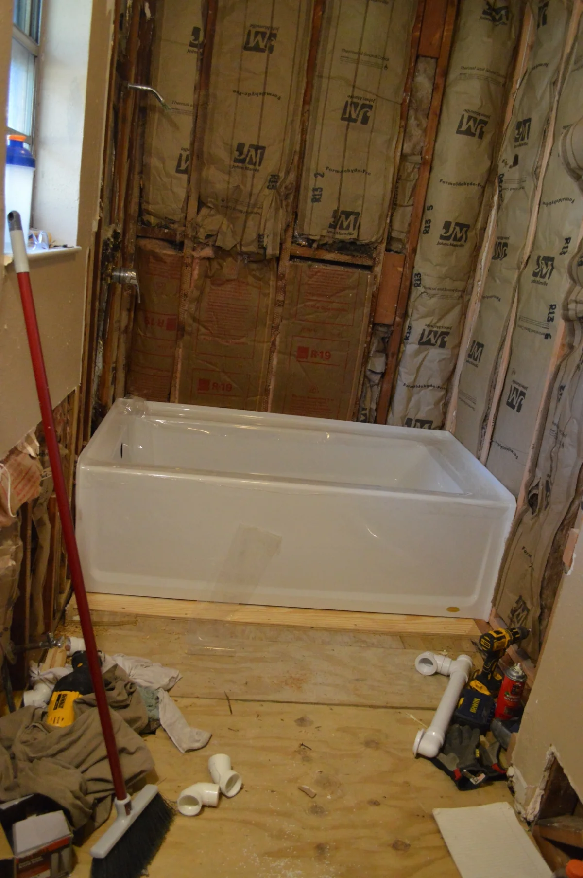 Once KB got into the floor, he saw that all of the floor joists were rotten through. He had to replace all of the joists and the subfloor before he could do anything else. This added at least two weeks to our time table. Once we got the floors put back in, it was time to put the bathtub in place. Mortar base was laid, tub was leveled and shimmed, and then pressed into place.