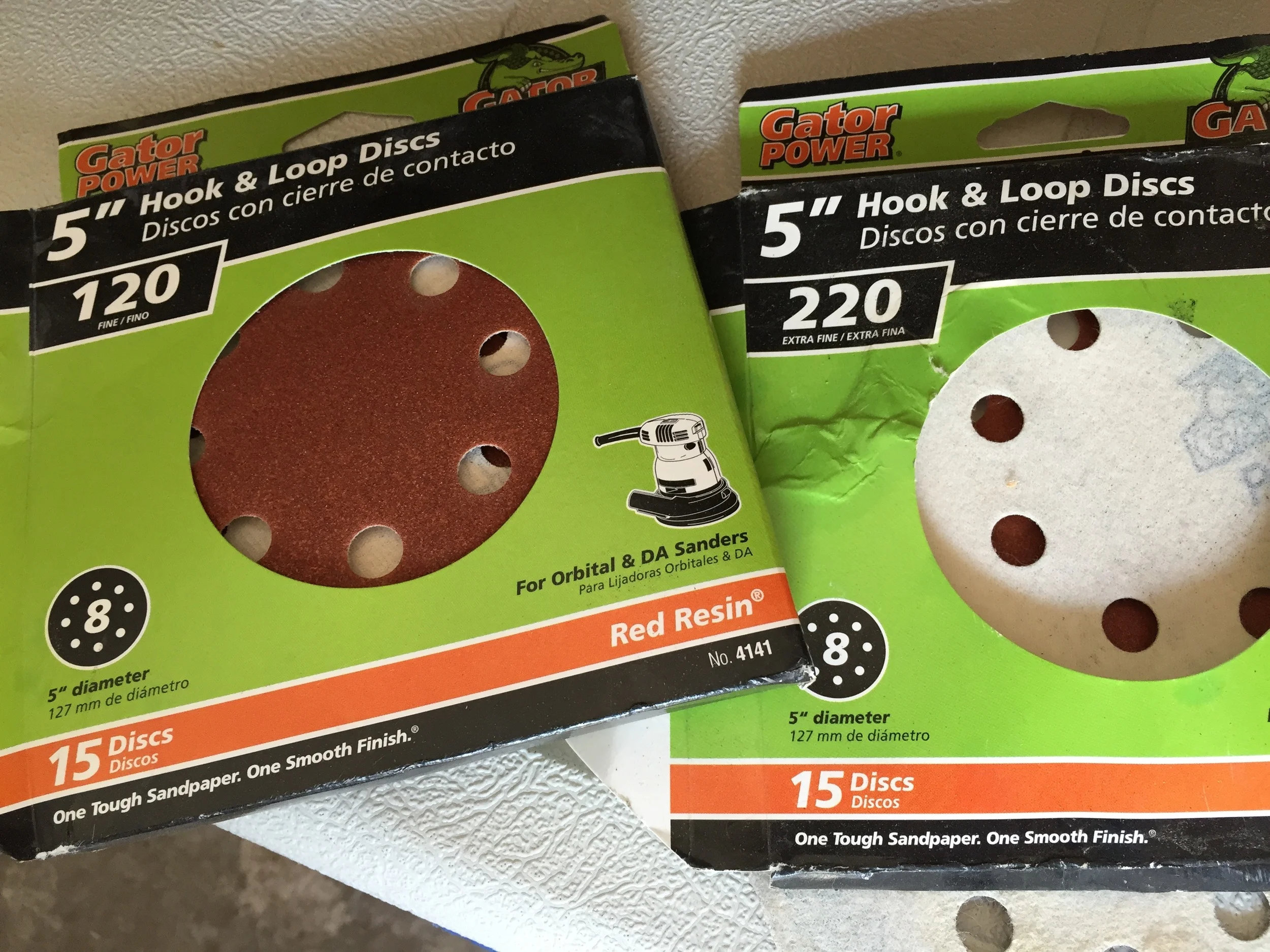 I sanded first using 120 grit paper and a rotary sander. I think the 120 does a great job at quickly removing varnish without wasting a lot of paper. I finished with a 220 grit to give it that smooth even feel.