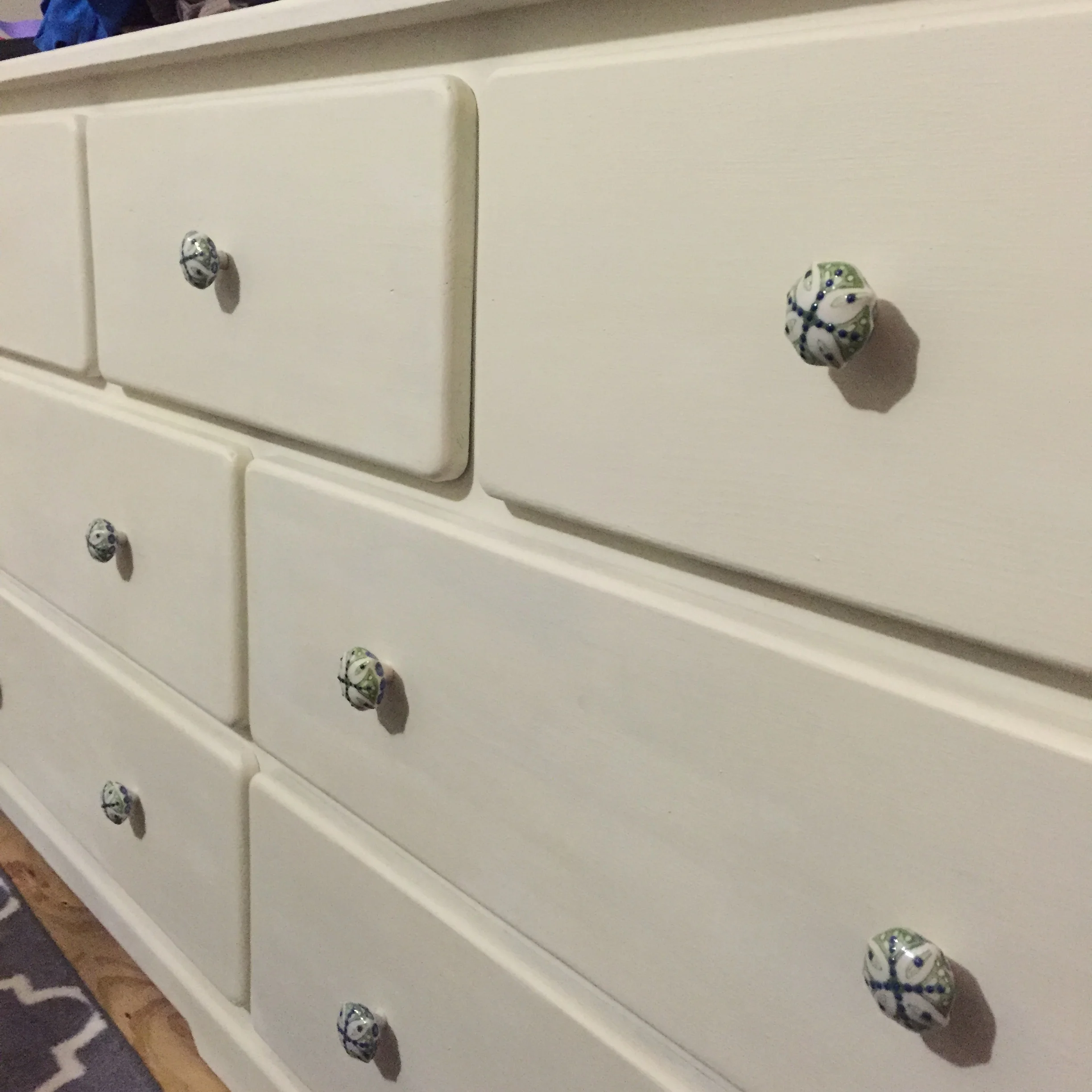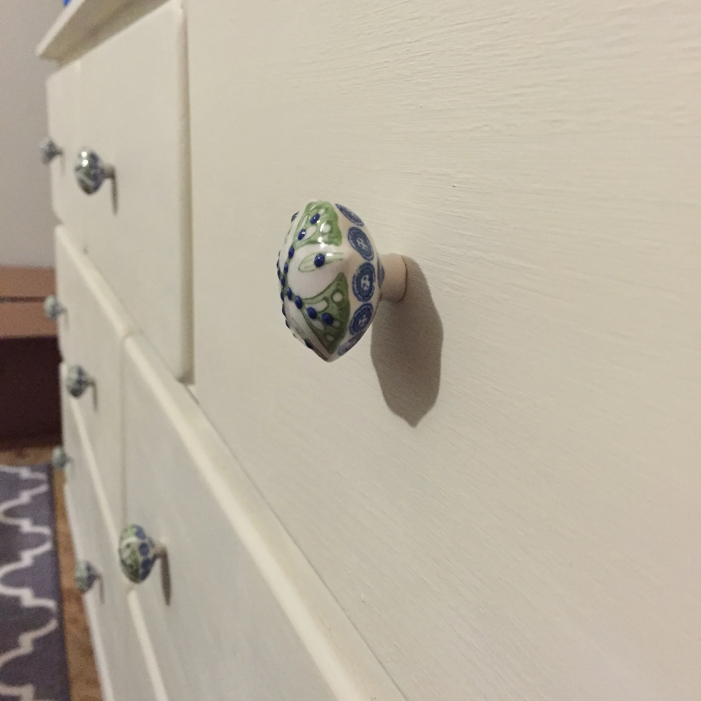 Now that it's all done, find some hardware (if you want) that you like to finish off the piece. I had these cute Anthro knobs on our side tables so I wanted to add them to our dresser too - for a matching finale. I predrilled the holes in each drawer and attached these FABULOUS knobs. I think it turned out pretty great looking.