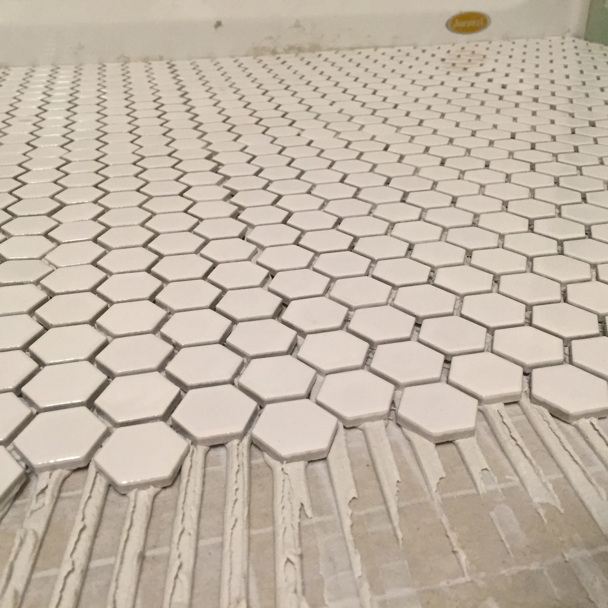 /So I assumed that once the demo was completed and we were starting to lay out exact plans that it would seem a little more real. It wasn't the case. BUT, once we started laying the tile, things just looked so perfect. Definitely what I wanted and expected. I knew very early on that White Subway tiles were an absolute must in the shower - so for the floors I had to choose something that wouldn't distract from the perfection that is subway tile but also something that looked great itself and was practically self-cleaning. The latter doesn't exist, but easy to clean was good enough for me. Because let's be honest. I've got two kids under 3. And I'd like to add more to our crew. But Momma's gotta clean. And it better not take all day. I digress. TILE! We chose a 1/4 inch thick white ceramic hexagon tile with a white grout. Side bar- My take on Cape Cod design is a little more clean than the 'average' Cape home - hence the white everything. Remind me to tell you about my capsule wardrobe. I have issues (obsessions) with basics.