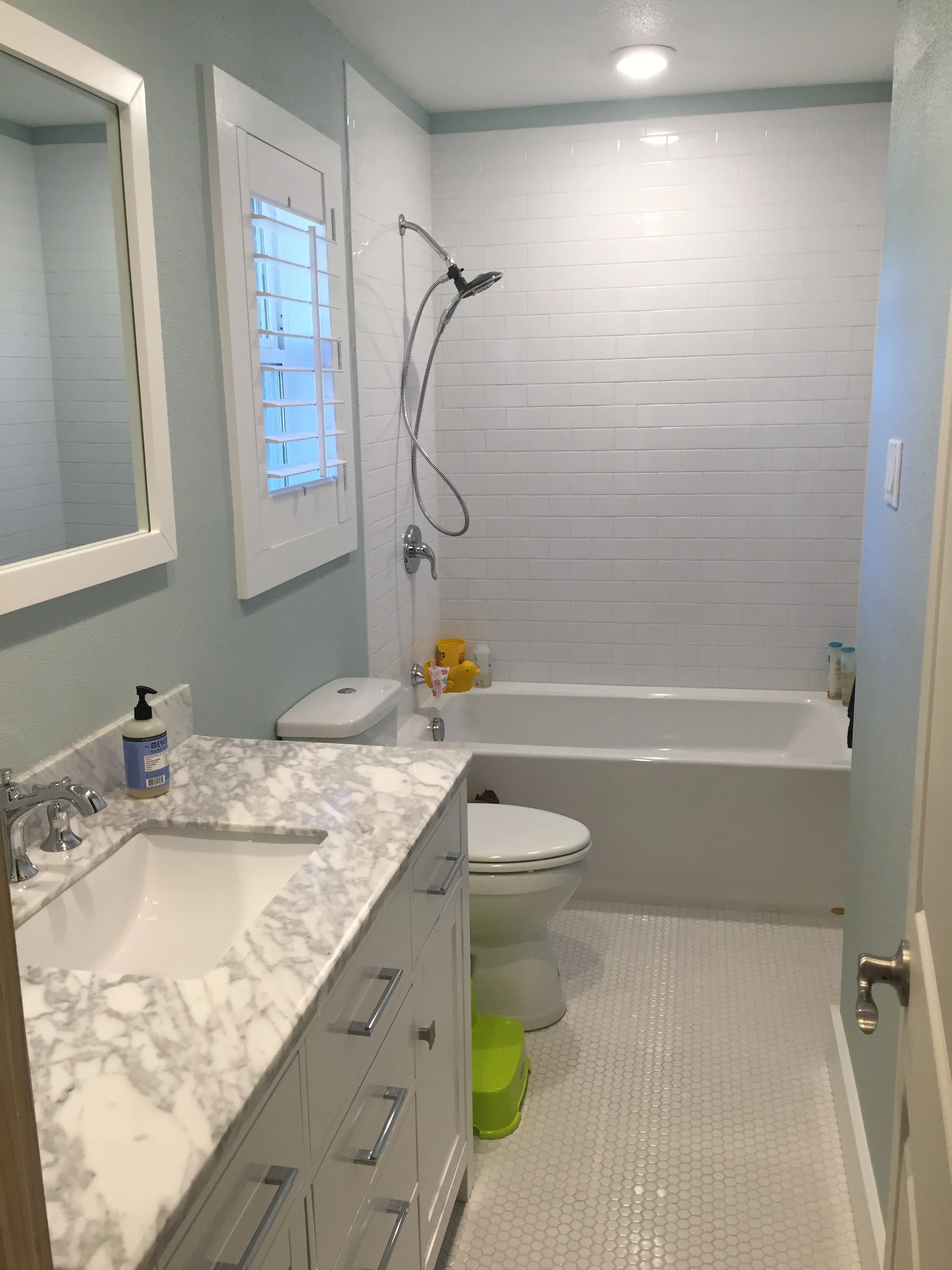Next was the window replacement. Our house was built in the 60's and all of our windows are the originals. They are all in desperate need of replacement. However, we're not wealthy. So we're going to have to do it a couple at a time. First up: bathroom. I knew I wanted a plantation shutter as the window treatment for the bathroom. It allows light in and is easy to close/open. It's SO easy to clean and keeps little fingerprints from getting all over the window itself. They aren't cheap either, but it's a must. We'll add them around the house too. We had to build out a frame we desired around the window. I went less 'Craftsman' and more 'Cape Cod' with the trim and I think with the shutter it works perfectly.